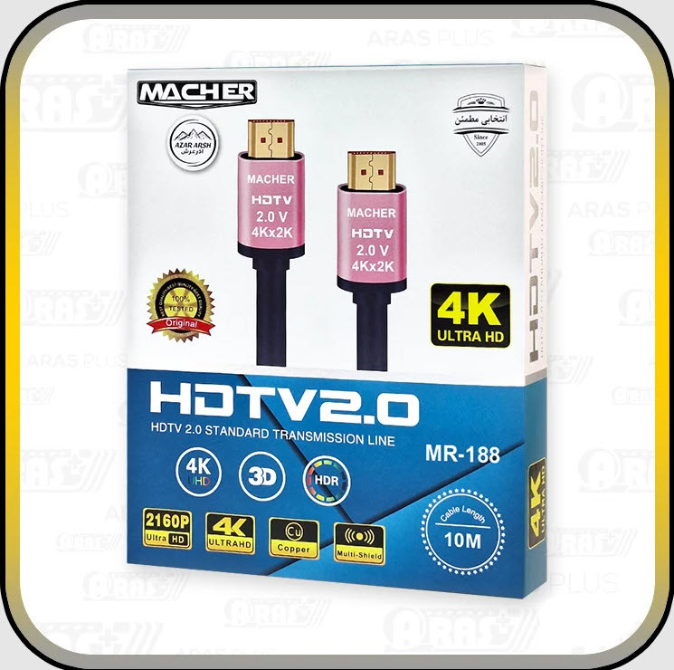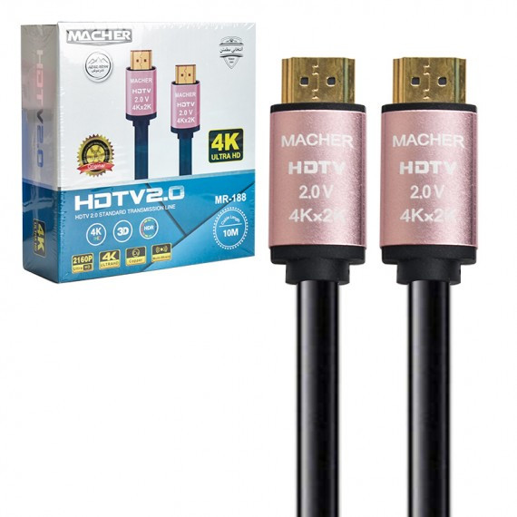 کابل MACHER MR-188 یک کابل HDMI 4K Ultra HD با طول ۱۰ متره که برای وصل کردن انواع دستگاههای تصویری طراحی شده. این کابل بهطور کامل از تصاویر با رزولوشن 4K پشتیبانی میکنه و میتونی ازش برای اتصال تلویزیون، پروژکتور، لپتاپ، کنسولهای بازی و پخشکنندههای حرفهای استفاده کنی.