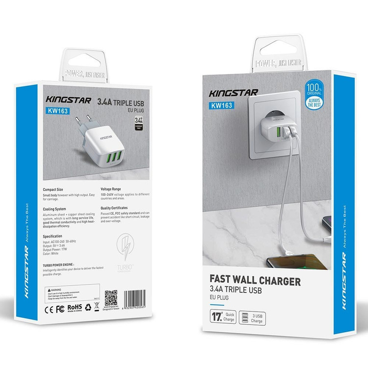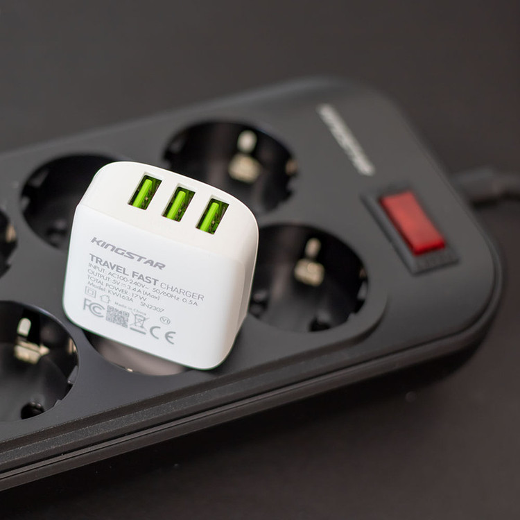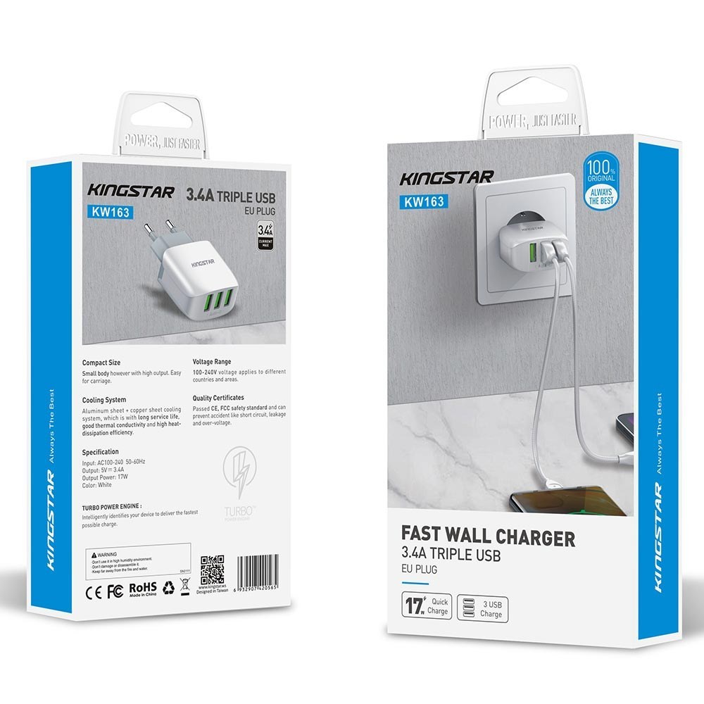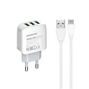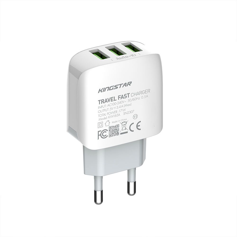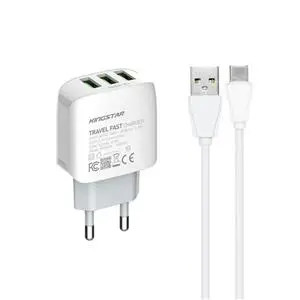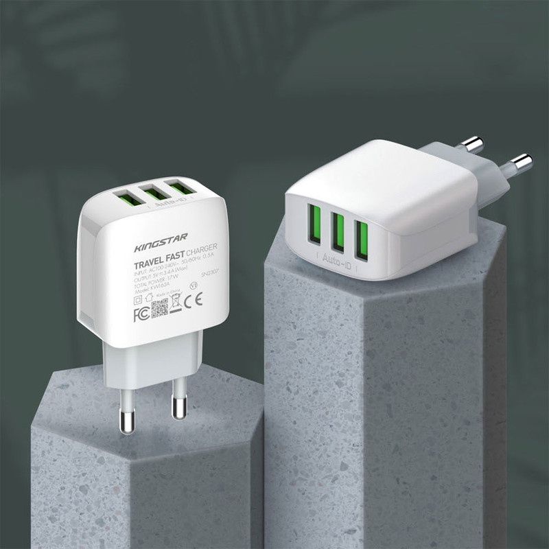 آداپتور شارژ KINGSTAR KW163C یک شارژر دیواری با سه پورت USB است که امکان شارژ همزمان سه دستگاه را فراهم میکند.
